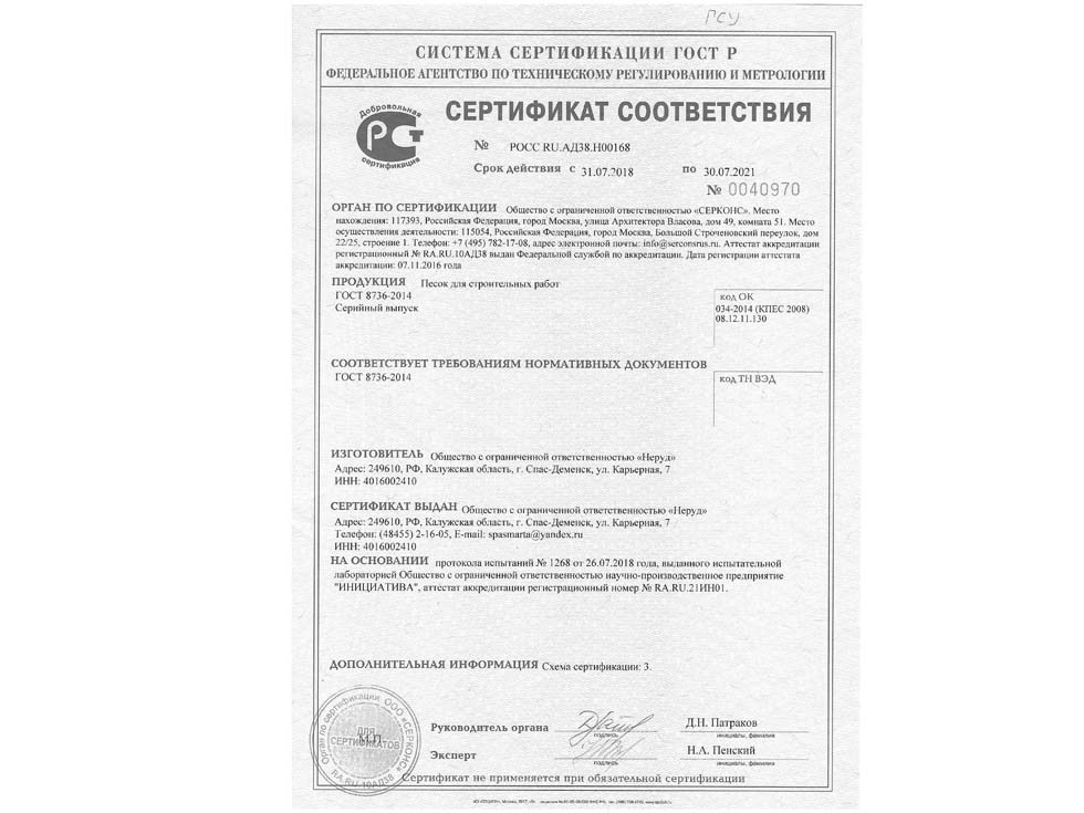 Ознакомьтесь с паспортами качества и сертификатами на поставляемую нашей компанией продукцию, прежде чем сделать заказ. Это позволит вам экономить средства причем не только по возможным рискам, но и при заказе материала, к примеру когда на объект требуются именно конкретные показатели. Есть требования при которых вы можете использовать на объекте менее прочный материал, что естественно сказывается на его стоимости. Для обратной засыпки траншеи допускается использование карьерного песка, а для устройства верхней подушки основания только намывной – поэтому использование послойно разных типов песка может существенно удешевить затраты на строительство.