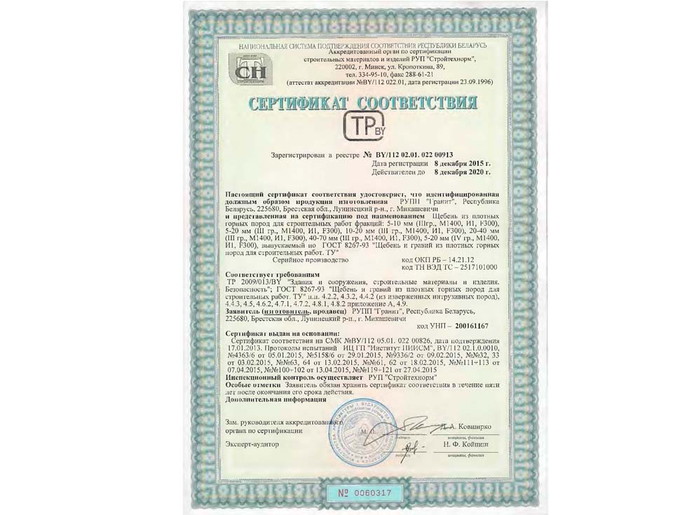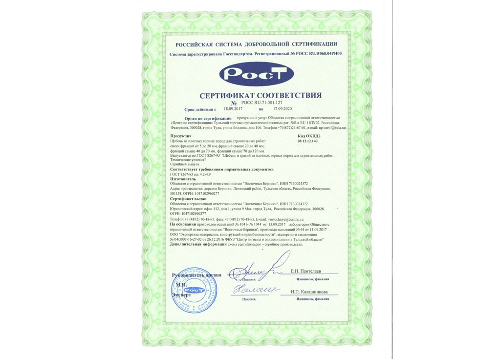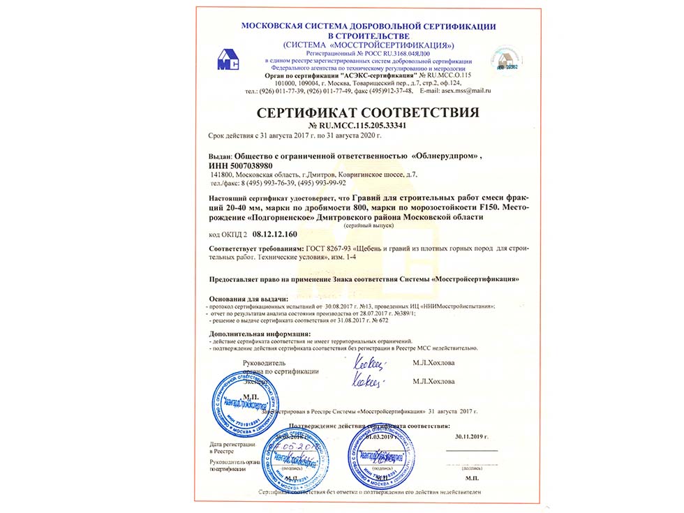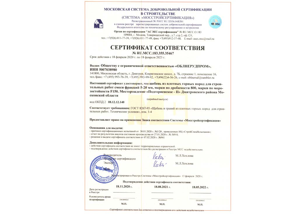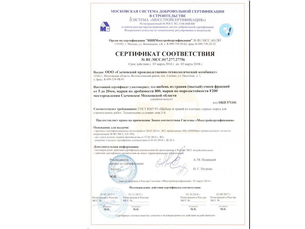 Наличие сертификата соответствия свидетельствует о том, что материал соответствует строительным нормам и ГОСТу. К примеру гранитный щебень должен по качеству и составу породы соответствовать ГОСТ 25607-209 «Смеси щебено-гравийно-песчаные для покрытий и основания автомобильных дорог и аэродромов». Сертификат должен быть обязательно должен быть зарегистрирован в реестре МСС, в противном случае он является недействительным и в случае проверки качества материалов или приемки работ на объекте в приемке работ будет отказано, что влечет за собой. Группа Компаний «25Л Снаб» использует в поставках только сертифицированные материалы подтвержденные сертификатом.