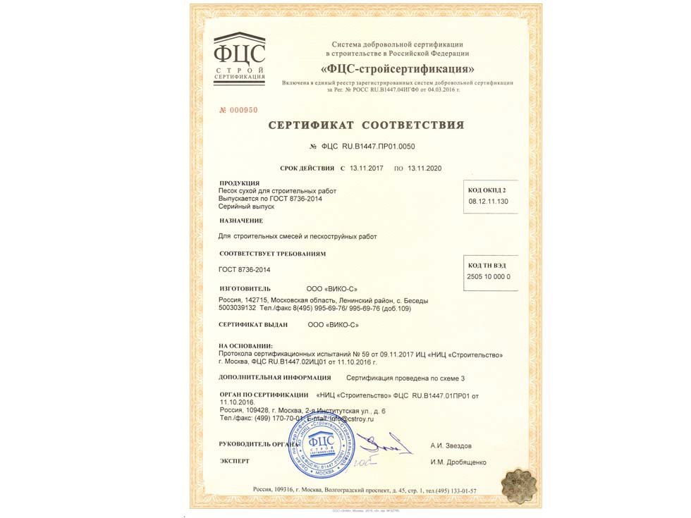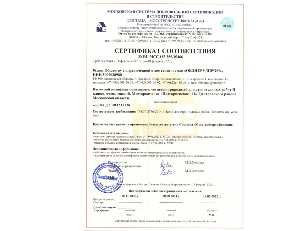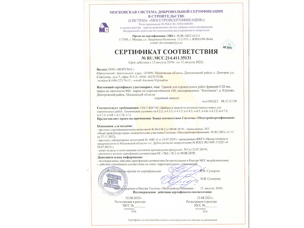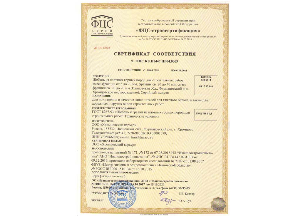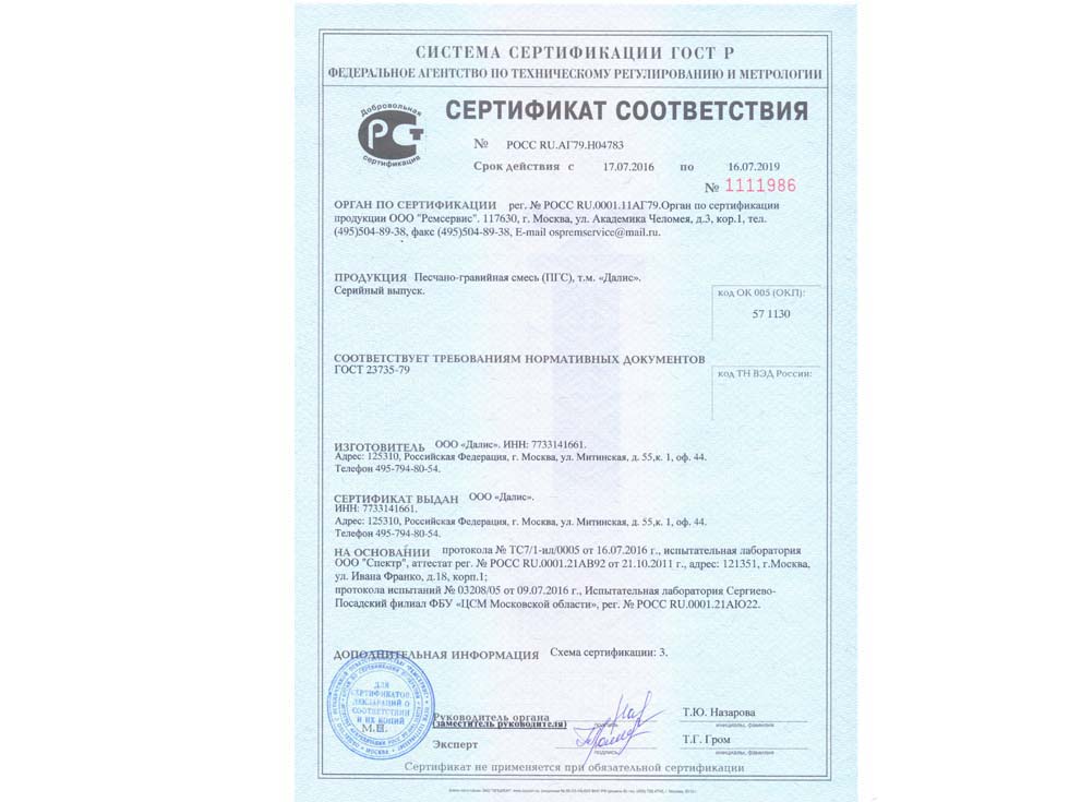 Наличие сертификата соответствия свидетельствует о том, что материал соответствует строительным нормам и ГОСТу. К примеру гранитный щебень должен по качеству и составу породы соответствовать ГОСТ 25607-209 «Смеси щебено-гравийно-песчаные для покрытий и основания автомобильных дорог и аэродромов». Сертификат должен быть обязательно должен быть зарегистрирован в реестре МСС, в противном случае он является недействительным и в случае проверки качества материалов или приемки работ на объекте в приемке работ будет отказано, что влечет за собой. Группа Компаний «25Л Снаб» использует в поставках только сертифицированные материалы подтвержденные сертификатом.